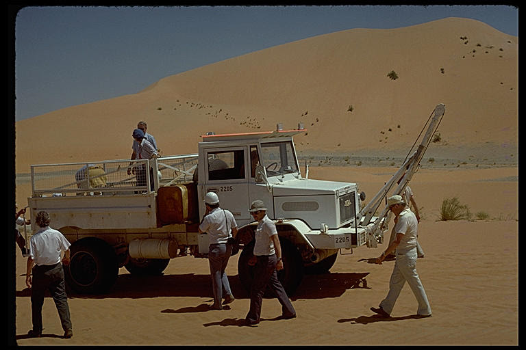 4- الرحالة مع البدو من اليسار إلى اليمين: مجهول- خميس- مجهول- سيسل- توم بارجر- جوني توماس- مجهول ( x, Khamis, x, Cecil, Tom Barger, Johnny Thomas, x)